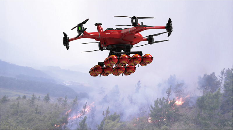 哈瓦救援無人機滅火彈系統:單駕次搭載16個滅火球,滅火面積可達100立方米。并同時喊話系統等其他任務模塊。
