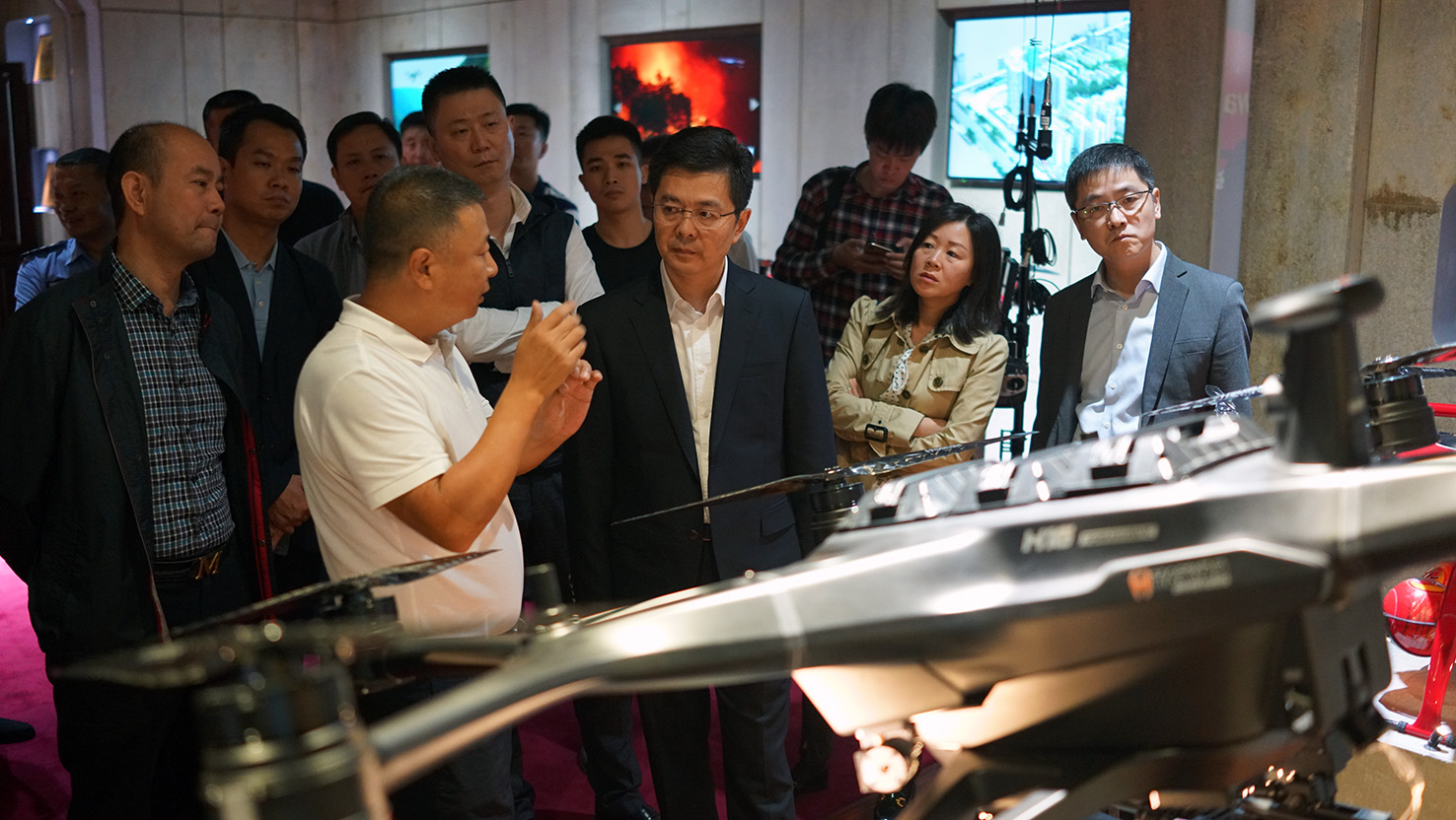 斌,龍華區公安分局副局長寇俊卿及一行領導在哈瓦董事長叢保衛先生的陪同下,參觀了哈瓦特種裝備無人機產品展示廳、智能數